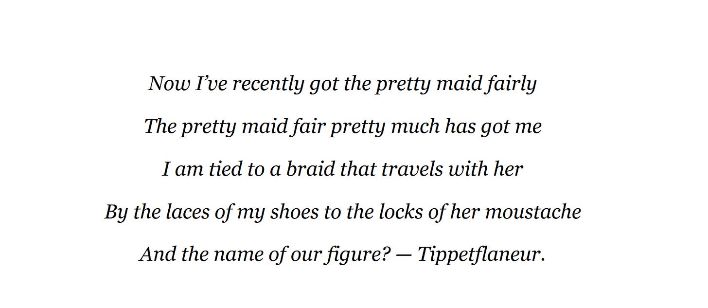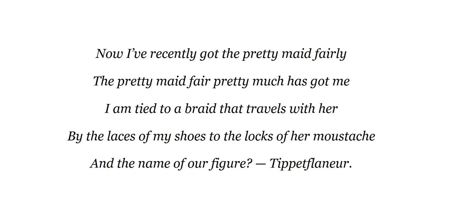 Take my hand, lovey, coxcomb, and we’ll be one motion of a swishing horsetail, a dappling rainbow. I am leading the way! Pulling you along, a motion afflux, over the aeolian dunes, sifting their tops. Their sprinkles are golden agleam in the air they join. The wind is playing the pipe for the sand and the pipe music gives my running-step which is twice the step that two people dance, you and me, lovelydovelydum.